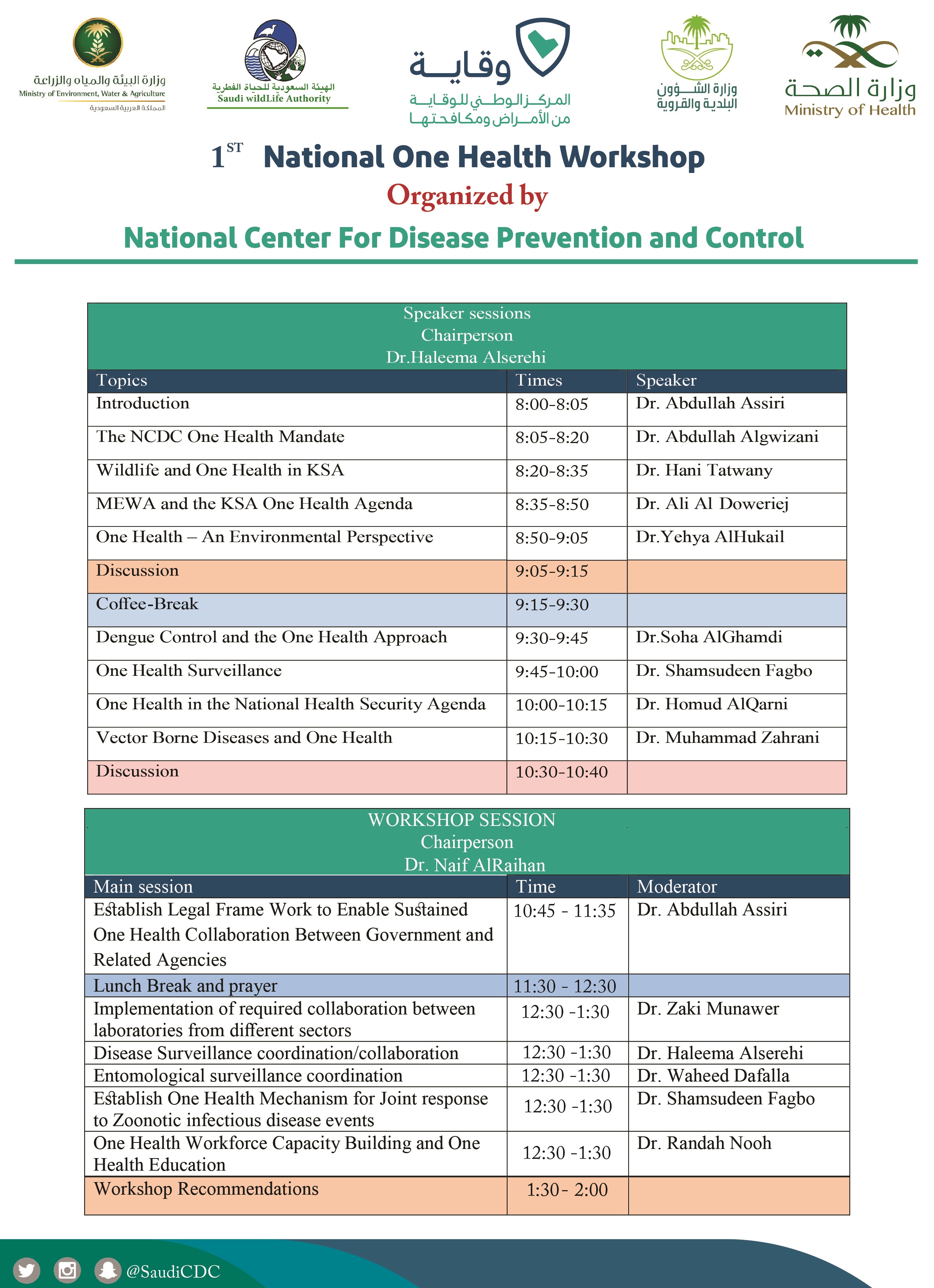 The first ever One Health Workshop in Saudi Arabia had a rich mix of 73 participants representing various One Health stakeholders in the country including the academia. Issues discussed cut across the human, animal and environmental health domains of the One Health approach. These included establishing a legal framework to enable sustained One Health collaboration between One Health stakeholders; Prioritization of zoonotic diseases; coordination and collaboration of disease and entomological surveillance; One Health Workforce capacity development; and joint outbreak response mechanisms.