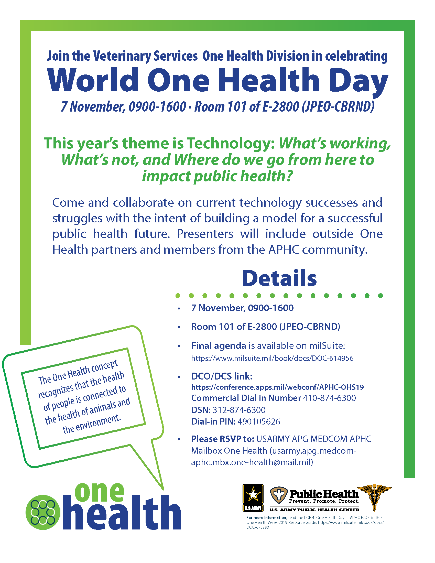 Join the Veterinary Services One Health Division in celebrating World One Health Day! In celebration of One Health Week 2019, the One Health Division is hosting the second annual One Health Day Seminar at APHC on 7 November, 2019. This year’s theme is Technology: What’s working, What’s not, and Where do we go from here to impact public health?